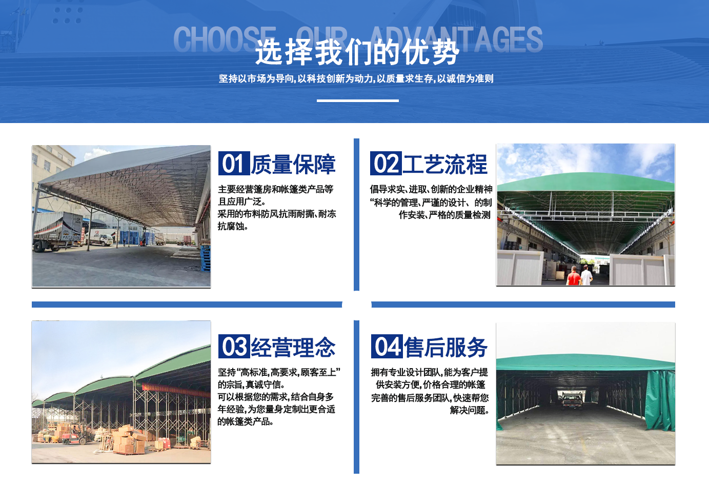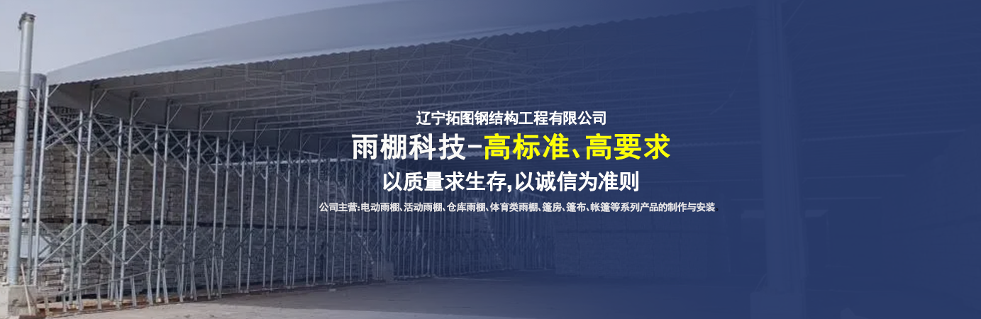 遼寧拓圖鋼結(jié)構(gòu)工程有限公司是一家專業(yè)從事推拉篷設(shè)計(jì)、制作、安裝、使用、維修的綜合性公司。公司主營(yíng):電動(dòng)雨棚、活動(dòng)雨棚、倉(cāng)庫(kù)雨棚、體育類雨棚、篷房、篷布、帳篷等系列產(chǎn)品的制作與安裝。 遼寧拓圖鋼結(jié)構(gòu)工程有限公司堅(jiān)持以市場(chǎng)為導(dǎo)向,以科技創(chuàng)新為動(dòng)力,以質(zhì)量求生存,以誠(chéng)信為準(zhǔn)則,倡導(dǎo)求實(shí)、進(jìn)取、創(chuàng)新的企業(yè)精神。“科學(xué)的管理、嚴(yán)謹(jǐn)?shù)脑O(shè)計(jì)、 的制作安裝、嚴(yán)格的質(zhì)量檢測(cè)、良好的后期服務(wù)成就企業(yè)的信譽(yù),為您提供優(yōu)質(zhì)服務(wù)。 遼寧拓圖鋼結(jié)構(gòu)工程有限公司傾力于開發(fā)應(yīng)用三維空間結(jié)構(gòu)與新材料的結(jié)合,將廣告藝術(shù)視覺(jué)表現(xiàn)形式與張力膜材科學(xué)的結(jié)合,推出多彩推拉蓬,依靠先進(jìn)的科學(xué)技術(shù),將推拉蓬建筑表現(xiàn)形式無(wú)限延伸,立志走在建筑科學(xué)的前沿,引導(dǎo)建筑時(shí)尚潮流,我們的目標(biāo)是使推拉蓬建筑在中國(guó)發(fā)展壯大。 遼寧拓圖鋼結(jié)構(gòu)工程有限公司憑著極強(qiáng)的事業(yè)熱情和豐富的專業(yè)經(jīng)驗(yàn)以“勤勉進(jìn)取、銳意創(chuàng)新、至誠(chéng)至信”的精神使公司得到迅速健康發(fā)展,業(yè)務(wù)范圍遍及全國(guó)。科學(xué)的管理、嚴(yán)謹(jǐn)?shù)脑O(shè)計(jì)、高標(biāo)準(zhǔn)的制作安裝流程,嚴(yán)格把控產(chǎn)品質(zhì)量,熱誠(chéng)的售后服務(wù)是企業(yè)競(jìng)爭(zhēng)力的源泉。 遼寧拓圖鋼結(jié)構(gòu)工程有限公司人愿以最誠(chéng)摯的態(tài)度,歡迎廣大客戶的蒞臨與溝通!愿為市場(chǎng)提供優(yōu)...